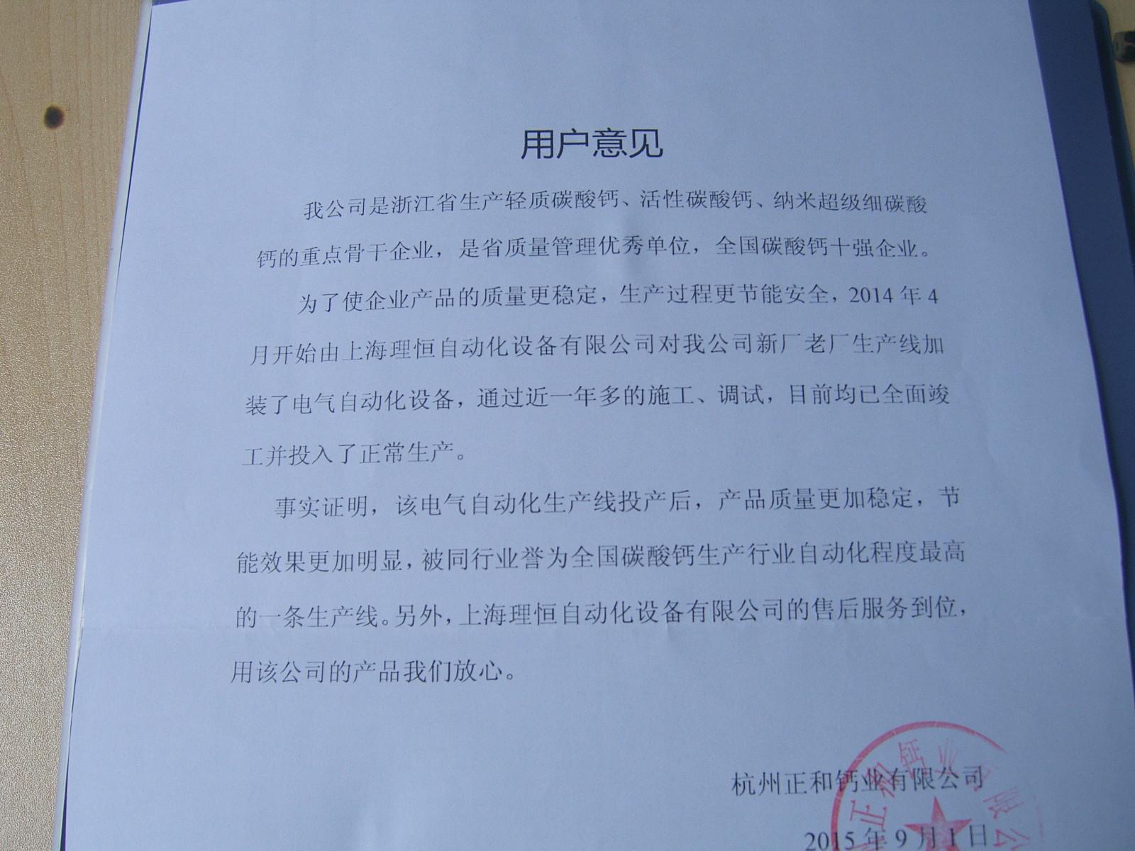 下圖為該碳酸鈣生產(chǎn)廠家出具的對我公司的設(shè)計(jì)、編程、施工及售后服務(wù)的高度評價(jià)的“用戶意見書”