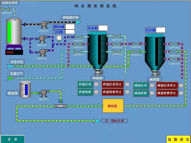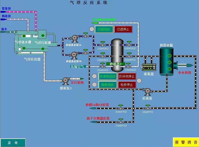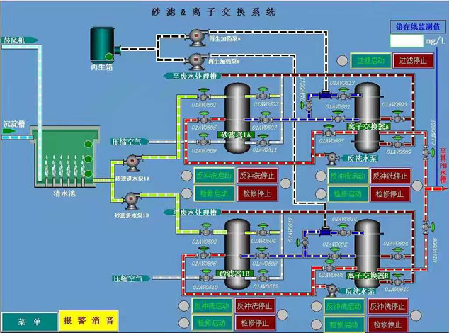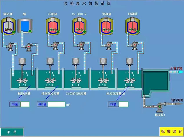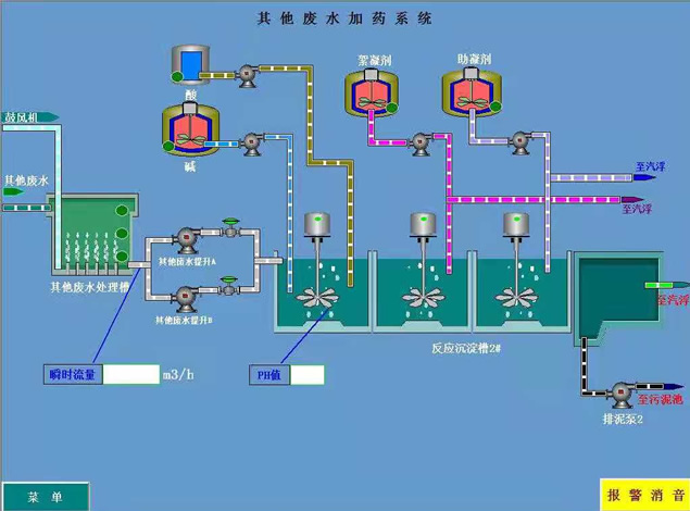 這是在主控室我司制作的針對(duì)該企業(yè)在生產(chǎn)過程中產(chǎn)生的污染廢水處理的PLC編程操作畫面