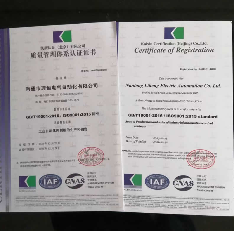 前不久,經(jīng)中國(guó)質(zhì)量認(rèn)證中心有關(guān)專家的現(xiàn)場(chǎng)檢查復(fù)核,認(rèn)定我司工業(yè)自動(dòng)化控制柜的生產(chǎn)和銷售體系符合GB/T19001-2016/ISO9001:2015標(biāo)準(zhǔn),并給我司頒發(fā)了認(rèn)證證書。