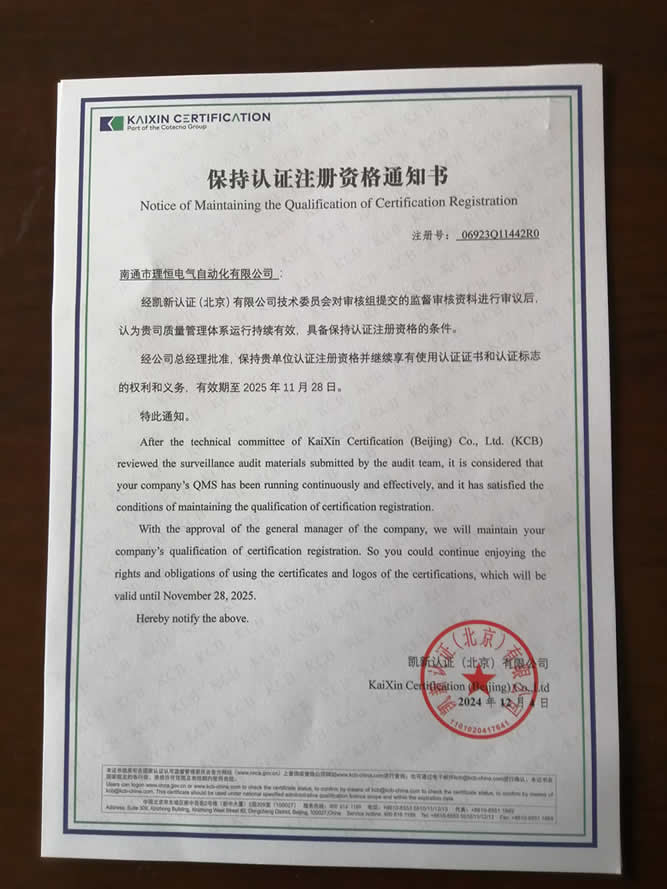 日前,我司收到國家質(zhì)量管理認證中心發(fā)來的通知書,經(jīng)專家驗收,我司繼續(xù)保持認證注冊資格,并繼續(xù)享有使用認證證書和認證標志的權(quán)利和義務(wù)。
